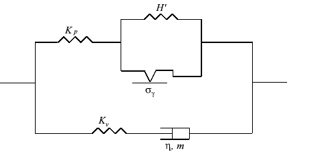 The material behavior is broken down into three parts: elastic, plastic, and viscous. Figure 1 shows a one-dimensional idealization of this material model, with the elastic-plastic and