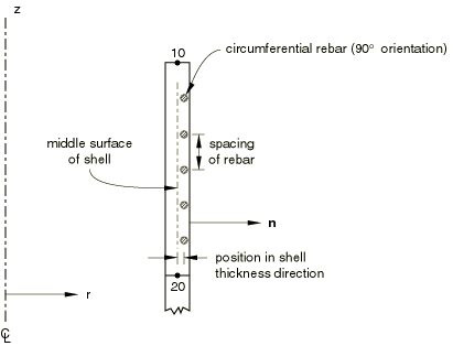 Rebars in an axisymmetric membrane element or an axisymmetric surface element must lie in the element reference surface, whereas rebars in an axisymmetric shell can lie in the shell reference surface or can be offset from the midsurface. Rebars in axisymmetric membrane, shell, and surface elements can be defined to have any angular orientation with respect to the r–z plane. See Figure 6 for an example of circumferential rebars and Figure 1 for an example of radial rebars in axisymmetric shells.