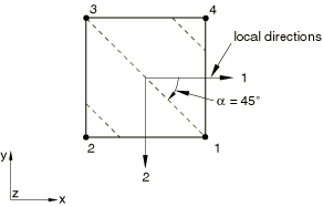 As a result of finite-strain effects, rebars rotate but remain aligned with the element isoparametric directions. If the same problem is modeled using anisotropic material properties rather than rebars and the material directions (1 and 2) are initially aligned with the element isoparametric directions, under such large shear deformation the material directions rotate and are no longer aligned with the element isoparametric directions. The material directions in this case are determined based on the average rigid body rotation of the material point. Hence, if the material is not truly a continuum, the anisotropic behavior is better modeled with rebars.