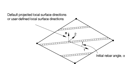You can specify one or multiple layers of reinforcement in membrane, shell, or surface elements. For each layer, you specify the rebar properties including the rebar layer name; the cross-sectional area of each rebar; the rebar spacing in the plane of the membrane, shell, or surface element; the position of the rebars in the thickness direction (for shell elements only), measured from the midsurface of the shell (positive in the direction of the positive normal to the shell); the rebar material name; the initial angular orientation, in degrees, measured relative to the local 1-direction; and the isoparametric direction from which the rebar angle output will be measured.