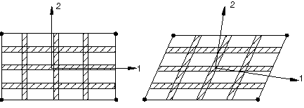 A positive angle defines a rotation from local direction 1 to local direction 2 around the element's normal direction or the user-defined normal direction. If the shell, membrane, or surface element is curved in space, the local 1-direction will vary across the element and the initial rebar angular orientation will also vary accordingly. The orientation definition that can optionally be associated with a shell or membrane section definition has no influence on the rebar angular orientation definitions. For example, in a membrane section, shell section, or surface section, the following data would result in the rebar layer definition shown in Figure 4: A=0.01; s=0.1; distance of rebar from the shell midsurface=0.0; =30.; and the rebar definition refers to a local rectangular orientation defined to have its X-axis go through the point (−0.7071, 0.7071, 0.0), its plane include the point (−0.7071, −0.7071, 0.0), and an additional rotation of 0.0 degrees about the 3-direction.