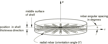 Angular spacing values can also be used for non-radial rebars as well as for rebars having nonzero orientation angles from the meridional plane. In these cases the orientation angles of the rebars do not change. The angular spacing option is used only to compute the spacing between rebars in units of length by multiplying the angular spacing by the radial distance of the concerned point on the rebar from the axis of axisymmetry. A local cylindrical coordinate system must be defined for the rebar if the rebar is associated with three-dimensional elements.
