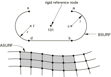 RIGID SURFACE, TYPE=SEGMENTS, NAME=name, REF NODE=nSTART, starting point X- or r-coordinate, starting point Y- or z-coordinatedata lines to define the endpoints of the line segments forming the surface, beginning with the word LINE (for straight line segments), CIRCL (for circular arc segments), or PARAB (for parabolic arc segments)