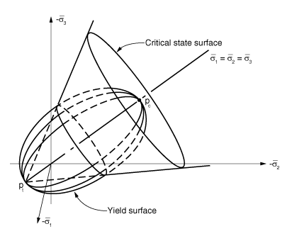 Figure 1. Cam-clay yield and critical state surfaces in principal stress