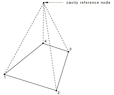 The hydrostatic fluid elements appear as surface elements that cover the cavity boundary, but they are actually volume elements when the cavity reference node is accounted for. Figure 1 depicts the 4-node hydrostatic fluid volume element, F3D4. The dashed lines indicate that the element is actually pyramidal in shape.