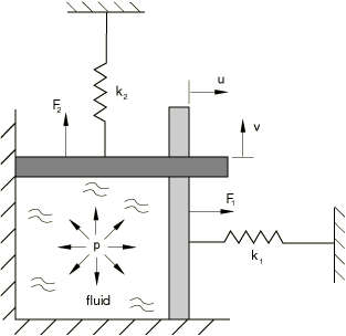 If the fluid is considered incompressible, application of the downward force causes the fluid to compress vertically and expand horizontally, while maintaining the original fluid volume. Thus, the model can be adequately discretized as a three degree of freedom system: the horizontal displacement of the right platen, u; the vertical displacement of the top platen, v; and the fluid pressure, p. The corresponding system of equations in matrix form is