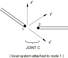 A JOINTC element consists of two nodes, referred to here as nodes 1 and 2. Each node has six degrees of freedom: displacements and rotations . A local orientation is defined for the element by the user. In a large-displacement analysis that local system rotates with the first node of the element.