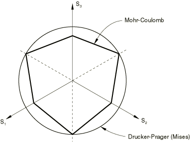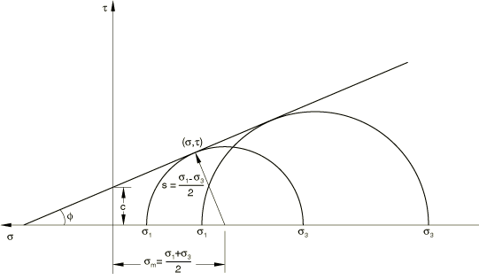 ProductsAbaqus/StandardAbaqus/Explicit The Mohr-Coulomb failure or strength criterion has been widely used for geotechnical applications. Indeed, a large number of the routine design calculations in the geotechnical area are still performed using the Mohr-Coulomb criterion. The Mohr-Coulomb criterion assumes that failure is controlled by the maximum shear stress and that this failure shear stress depends on the normal stress. This can be represented by plotting Mohr's circle for states of stress at failure in terms of the maximum and minimum principal stresses. The Mohr-Coulomb failure line is the best straight line that touch es these Mohr's circles (Figure 1). Thus, the Mohr-Coulomb criterion can be written as where is the shear stress, is the normal stress (negative in compression), c is the cohesion of the material, and is the material angle of friction. ![]() From Mohr's circle, Substituting for and , the Mohr-Coulomb criterion can be rewritten as where is half of the difference between the maximum and minimum principal stresses (and is, therefore, the maximum shear stress) and is the average of the maximum and minimum principal stresses (the normal stress). Thus, unlike the Drucker-Prager criterion, the Mohr-Coulomb criterion assumes that failure is independent of the value of the intermediate principal stress. The failure of typical geotechnical materials generally includes some small dependence on the intermediate principal stress, but the Mohr-Coulomb model is generally considered to be sufficiently accurate for most applications. This failure model has vertices in the deviatoric stress plane (see Figure 2). ![]() Strain rate decompositionAn additive strain rate decomposition is assumed: where is the total strain rate, is the elastic strain rate, and is the inelastic (plastic) strain rate. Elastic behaviorThe elastic behavior is modeled as linear and isotropic. Yield behaviorThe Mohr-Coulomb criterion written above in terms of the maximum and minimum principal stresses can be written for general states of stress in terms of three stress invariants. These invariants are the equivalent pressure stress, the Mises equivalent stress, where is the stress deviator, defined as and the third invariant of deviatoric stress, The Mohr-Coulomb yield surface is then written as where is the friction angle of the material in the meridional stress plane, where is the temperature and are other predefined field variables; represents the evolution of the cohesion of the material in the form of isotropic hardening (or softening); is the equivalent plastic strain, its rate defined by the plastic work expression and is the Mohr-Coulomb deviatoric stress measure defined as where is the deviatoric polar angle (Chen and Han, 1988) defined as The friction angle of the material, , also controls the shape of the yield surface in the deviatoric plane as shown in Figure 3. The range of values the friction angle can have is 0° 90°. In the case of 0° the Mohr-Coulomb model reduces to the pressure-independent Tresca model with a perfectly hexagonal deviatoric section. In the case of 90° the Mohr-Coulomb model would reduce to the “tension cutoff” Rankine model with a triangular deviatoric section and (this limiting case is not permitted within the Mohr-Coulomb model described here). ![]() Flow rulePotential flow is assumed, so where g can be written as and G is the flow potential, chosen as a hyperbolic function in the meridional stress plane and a smooth elliptic function in the deviatoric stress plane: where is the dilation angle measured in the p– plane at high confining pressure; is the initial cohesion yield stress; and is a parameter, referred to as the eccentricity, that defines the rate at which the function approaches the asymptote (the flow potential tends to a straight line as the eccentricity tends to zero). This flow potential, which is continuous and smooth in the meridional stress plane, ensures that the flow direction is defined uniquely in this plane. The function asymptotically approaches a linear flow potential at high confining pressure stress and intersects the hydrostatic pressure axis at 90°. A family of hyperbolic potentials in the meridional stress plane is shown in Figure 4. ![]() The flow potential is also continuous and smooth in the deviatoric stress plane (the -plane); we adopt the deviatoric elliptic function used by Menétrey and Willam (1995): where is the deviatoric polar angle defined previously, , and e is a parameter that describes the “out-of-roundedness” of the deviatoric section in terms of the ratio between the shear stress along the extension meridian () and the shear stress along the compression meridian (). The elliptic function has the value along the extension meridian and has the value along the compression meridian; this ensures that the flow potential matches the yield surface at the triaxial compression and extension in the deviatoric plane provided that e is defined appropriately (see further discussion later). Although the elliptic function is defined only in the sector , the polar radius extends to all polar directions using the three-fold symmetry shown in Figure 5. ![]() By default, the out-of-roundedness parameter, e, is dependent on the friction angle ; it is calculated by matching the flow potential to the yield surface in both triaxial tension and compression in the deviatoric plane: Alternatively, e can also be considered to be an independent material parameter; in this case the user can provide its value directly. Convexity and smoothness of the elliptic function requires that . The upper limit, (or 0°), leads to , which describes the Mises circle in the deviatoric plane. The lower limit, (or 90°), leads to and would describe the Rankine triangle in the deviatoric plane (this limiting case is not permitted within the Mohr-Coulomb model described here). Flow in the meridional stress plane can be close to associated when the angle of fric
