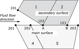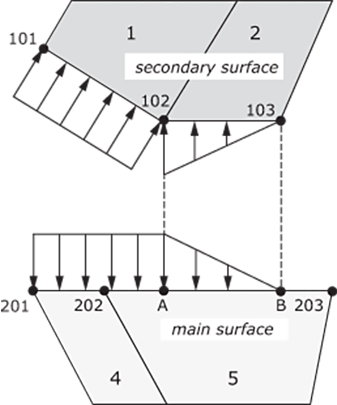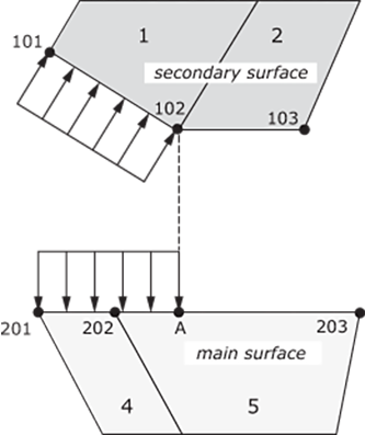 ProductsAbaqus/Standard A single secondary node–based penetration criterion is used. Fluid penetrates into the surface between the contacting bodies from one or multiple locations, which are exposed to the fluid, until a point is reached where the contact pressure is greater than the critical value specified by the user, cutting off further penetration of the fluid. The critical contact pressure is introduced to account for the asperities on the contacting surfaces. The higher this value, the easier the fluid penetrates. The default value of the critical contact pressure is zero, in which case fluid penetration occurs only if the contact pressure is zero and contact is lost. The nodes initially exposed to the fluid, which are specified by the user, are always subjected to the fluid pressure irrespective of the contact status at these nodes. The pressure penetration load is applied normal to surface faces in the wetted region based on the pressure penetration criterion described above at the beginning of an increment and remains constant over that increment even if the fluid penetrates further during that increment. For two-dimensional models the pressure acting on a given face of the secondary surface is uniform, except for the surface faces adjacent to the wetted region. A nondefault option can be chosen so that the pressure ramps off across these surface faces. For three-dimensional models the only option is for the pressure to ramp off across the surface faces adjacent to the wetted region. Consider the contact interaction of three nodes—101, 102, and 103—on the secondary surface made up of faces of two first-order elements, 1 and 2, with a main surface made up of faces of two elements, 4 and 5, which are described by nodes 201, 202, and 203, as shown in Figure 1. The pressure-penetration load acting on the main surface faces corresponds to the projection of the pressure distribution of the secondary surface. Point A corresponds to where node 102 projects to the main surface, and point B corresponds to where node 103 projects to the main surface. If a fluid with a pressure magnitude of f has penetrated up to node 102 on the secondary surface, pressure loads are applied as follows: