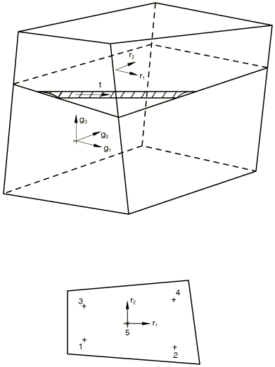 ProductsAbaqus/StandardAbaqus/Explicit Let be the isoparametric coordinates of the basic finite element in which the rebar are placed. Let , be isoparametric coordinates on the surface of reinforcement, with . Let t be a material coordinate along the rebar direction. See Figure 1. ![]() The rebar is integrated using or Gauss points, depending on the order of the underlying element. The volume of integration at a Gauss point is where is the cross-sectional area of each rebar, is the rebar spacing, is the Gauss weighting associated with the integration point, is the position of the Gauss point, and In these expressions all quantities are taken in the reference configuration, and so Abaqus ignores changes in rebar cross-sectional area due to straining of the rebar and changes in the rebar spacing due to straining of the finite element in which the rebar is placed. The strain in the rebar is where and G is the value of g in the original configuration. For convenience we define s, a material coordinate that is distance measuring along the rebar in the current configuration: The first variation of strain is and the second variation of strain is |