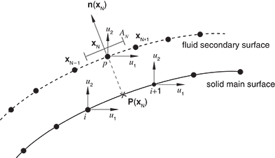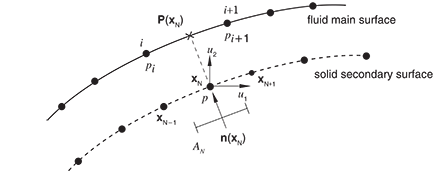In surface-based coupling the interaction surface is formed by the boundary between possibly nonconforming structural and acoustic meshes. Therefore, the fluid-solid coupling matrix cannot be broken up into a sum over element faces as simply as in the ASIn case. To derive the coupling matrices in the surface-based procedure, we use a variation of the main-secondary procedure used in small-sliding contact (see Small-sliding interaction between bodies). At the start of an analysis, the projections of secondary nodes onto the main surface are found, and the areas and normals associated with the secondary nodes are computed. The projections are points on the main surface; main nodes in the vicinity of this projection are identified. Variables at the secondary nodes are then interpolated from variables at the identified main surface nodes near the projection .