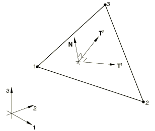 A local orthonormal basis system, and , is defined in the plane of each element in the reference configuration, using the standard Abaqus convention. and measure distance along and in the reference configuration.