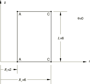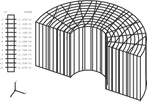 where Only a slice of the cylinder is considered. Plane strain conditions are applied by setting 0 everywhere. In the r-direction 10 elements are used in the second-order element models. In models using the first-order elements, 20 and 40 elements are used in the full- and reduced-integration models, respectively. Material:Linear elastic, Young's modulus = 30 × 106, Poisson's ratio = 0.3. Boundary conditions:0 everywhere; −9.9854 × 10−4 at and 0°, as obtained from the equation for above. These constraints eliminate the rigid body motions in the global z- and x-directions, respectively. Loading:The asymmetric pressure loads are prescribed by applying the appropriate nonuniform distributed load types on the inside and outside surfaces of the cylinder and defining the pressure stress equations for in user subroutine DLOAD. In the user subroutine, the value at each integration point, which is stored in Results and discussionThe analytical solution and the Abaqus results for the CAXA8n, CAXA8Rn, CAXA4n, and CAXA4Rn (n = 1, 2, 3 or 4) elements are tabulated below for a cylinder with these parameters: 6, 2, 6, and 10 × 103. The output locations are at points and on the 0° plane, where z can be any value along lines and in the figure shown on the previous page since the solution is independent of z, and at points E and G, which are at the corresponding locations on the 180° plane. The solutions predicted by Abaqus agree well with the exact solution. Closer agreement is anticipated if a denser mesh is used.