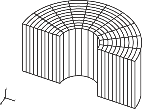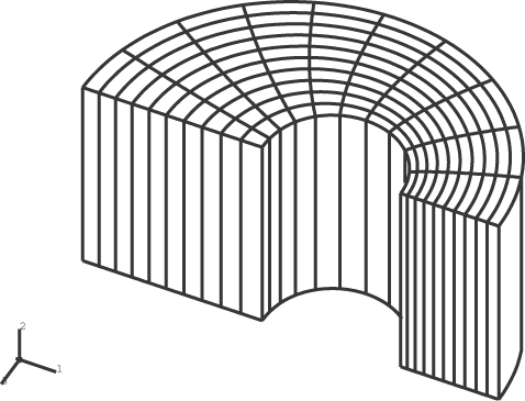 The results are independent of n, the number of Fourier modes. The variable is not compared, since is treated as an internal variable in these elements and is not available for output. The accuracy of may be assumed to be comparable to the accuracy of . Figure 1 through Figure 4 show plots of the undeformed mesh, the deformed mesh, the contours of , and the contours of , respectively, for the CAXA8R3 model. Input files