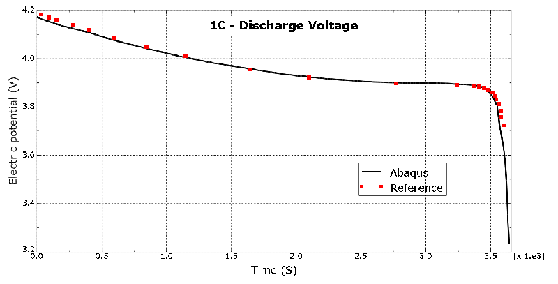 Products Abaqus/Standard Elements testedQEC3D8 QEC3D6 QEC3D4 Features testedThis verification problem tests the thermal-electrochemical behavior of a solid electrolyte battery modeled using a lithium metal anode and a solid cathode. The lithium ion battery involves the solution of lithium ion diffusion in the separator, as well as the charge transfer process at the interfaces of the anode-separator and cathode-separator. The interaction of the solid electrodes with the separator is modeled using a Butler-Volmer surface interaction load. Concentration of lithium in the cathode is modeled using diffusion process. Problem descriptionThe problem tests the lithium metal battery cell charging capabilities at different charge rates, as described in Tian et al. The results compare very well with that shown in Tian et al. Model:The geometric and other relevant parameters, including individual electrode thicknesses, of the cell are as described in Tian et al. The different electrodes are in nanometer lengths. The separator is 1500 nm long, and the cathode is 1820 nm long. Mesh:The finite element model consists of 3 elements each of type QEC3D8 or QEC3D6 or QEC3D4. The solid anode is modeled with one element through the thickness. The cathode and separator elements are modeled with one element each, respectively. Only one element is used in the plane because the setup is essentially 1D. The QEC3D8, QEC3D6, and QEC3D4 elements support thermal-electrochemical degrees of freedom. Material:The anode material is solid lithium, and the cathode is made up of lithium cobalt oxide. The thermal-electrochemical properties of the different regions described in Tian et al are used in the models included in this section. Loading:The battery is subjected to a current load that corresponds to a 1C discharge analysis. Results and discussionFigure 1 displays the discharge curves predicted by Abaqus, showing the evolution of the voltage difference across the cell during charge as a function of time for 1C rate and the simulation results from for the same C rate. A reasonably good correlation is observed. Input files