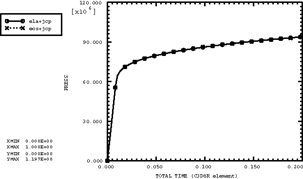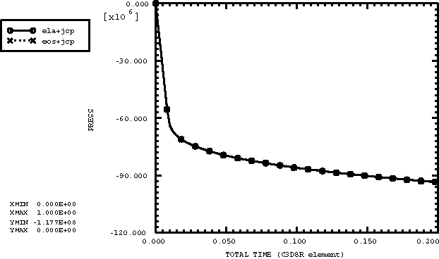 Figure 1. Pressure stress in uniaxial tension: elastic response versus linear type of equation of state response. Figure 2. Mises stress in uniaxial tension: elastic response versus linear type of equation of state response. Figure 3. Pressure stress in uniaxial compression: elastic response versus linear type of equation of state response. Figure 4. Mises stress in uniaxial compression: elastic response versus linear type of equation of state response.