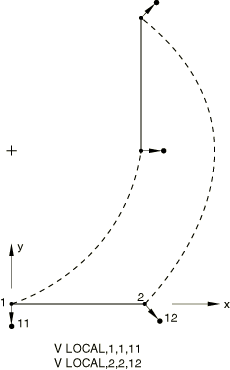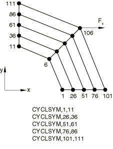 rotation degrees of freedom restrained because of the CYCLSYMMPC. Nodes 6, 11, and 1 have their