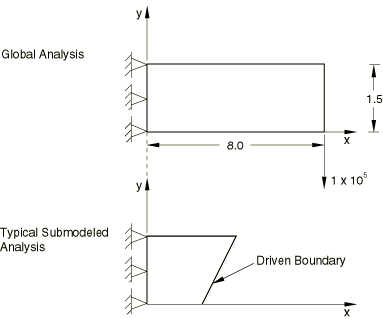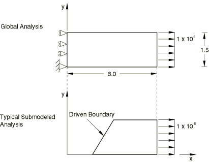 Features testedThe submodeling capability is applied to two-dimensional continuum stress/displacement elements. In Abaqus/Standard general static and linear perturbation procedures are used in various combinations for both the global and submodel analyses. In Abaqus/Explicit the procedures are quasi-static for both the global and submodel analyses. Problem descriptionModel:All global models have dimensions 8.0 × 1.5 in the x–y plane, with an out-of-plane dimension of 1.0 (plane stress analysis). Material: