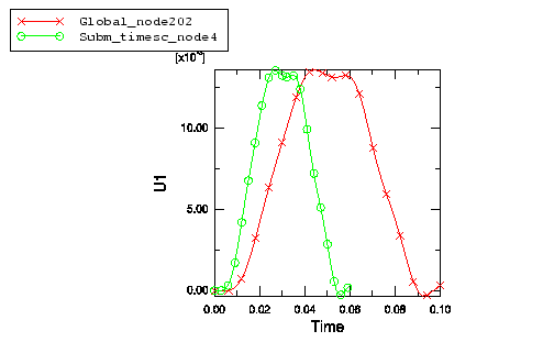 All of the driven variables are interpolated correctly from the global analysis. Figure 1 shows the effect of the TIMESCALE parameter on the amplitude formed at the driven nodes. If the analyses have the same step time, the two curves will be identical.