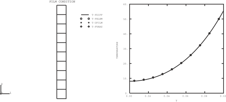 ProductsAbaqus/StandardAbaqus/Explicit Elements testedCPE3T CPE4RT CPS3T CPS4RT DC2D4 S4RT Features testedTemperature-dependent film conditions. Problem descriptionAn infinite plate of width 0.1 unit and thickness 1 unit is considered. A zero flux boundary condition is imposed on all of the surfaces except the top surface. A film condition and sink temperature are imposed on the top surface, and the transient solution to the heat transfer problem is sought. In Abaqus/Standard the problem is modeled with 10 DC2D4 elements of dimension 0.01 × 0.01. In Abaqus/Explicit two-dimensional (plane strain and plane stress) elements are used to model the plate: 10 elements are used through the width of the plate when using CPE4RT and CPS4RT elements, while 20 elements are used when using CPE3T and CPS3T elements. The problem is also modeled using S4RT elements in Abaqus/Explicit. Only one coupled thermal shell element is used, and the shell's thickness represents the length of the model. The film condition is applied on one face of the shell, and a large number of temperature points are considered through the thickness (19 points, which is the maximum allowable temperature points.) Material:Thermal conductivity, 1.4; sink temperature, 100(1 + t/3600); specific heat, 260; film coefficient, 10 + 0.02; density, 7800; initial temperature, 0. In Abaqus/Explicit dummy mechanical properties are prescribed to complete the material definition. Results and discussionThe transient solution at 3600 units is plotted for all four cases; the finite difference solution is plotted as a solid line, and the three finite element results as markers at the centroid of the elements. The results obtained with Abaqus/Explicit are in close agreement with those obtained with Abaqus/Standard. Input filesAbaqus/Standard input files