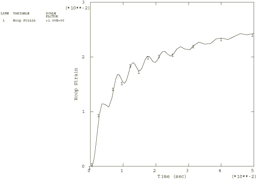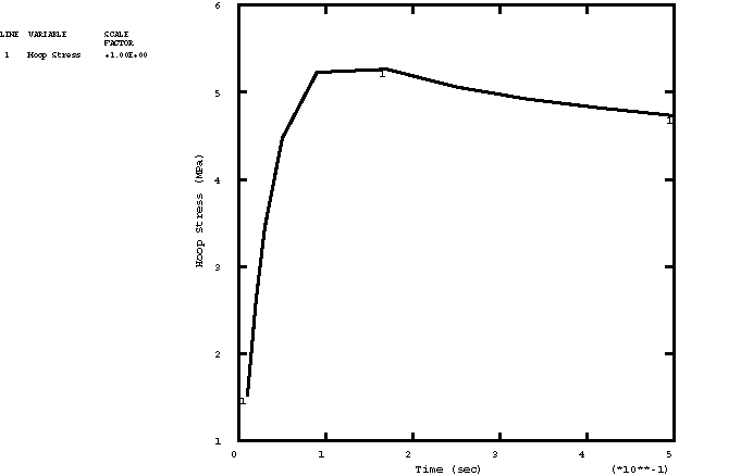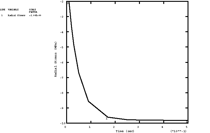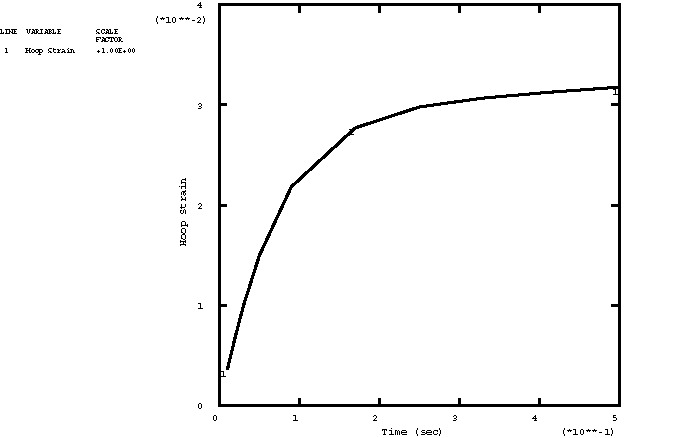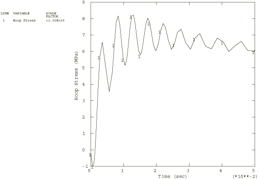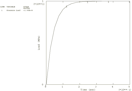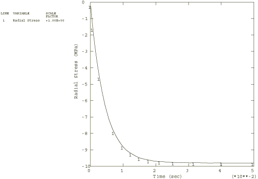 This model results in a very low long-term elastic modulus (0.4955 MPa), so the material almost behaves as a viscoelastic fluid. Because the viscoelastic material is incompressible throughout the problem, the relative moduli and time constants that constitute the extensional relaxation function can be used directly in the definition of the shear relaxation function. Contrast this with Viscoelastic rod subjected to constant axial load, in which the material is slightly compressible, so that the shear modulus and time constant were related to the extensional values through the bulk modulus. A solution to the present problem is also obtained by modeling the behavior of the viscoelastic cylinder with large-strain linear viscoelastic theory. The relaxation behavior is defined in the same way, but the short-term elastic properties are specified as part of the hyperelastic material definition. The polynomial formulation with 1 is used, and the constants are = 275.247 MPa , = 0 (neo-Hookean material) and = 7. × 10−7 MPa−1. These constants are such that the initial Young's modulus and initial Poisson's ratio are equal to and , respectively. The steel case is assumed to be linear elastic, with a Young's modulus of 200 GPa and a Poisson's ratio of 0.3. Loading:The time-dependent pressure loading used in the static analyses is A plot of this loading as a function of time is shown in Figure 2. To highlight inertia effects, the pressure loading in the dynamic analysis is applied 10 times faster: These pressure histories are specified using user subroutine DLOAD. AnalysisThe static analysis is done using the quasi-static procedure with a time period of 0.5 sec. A tolerance on the accuracy of the transient creep solution is specified to enable automatic time incrementation. The accuracy tolerance is set to 7.0 × 10−3, which is the same order of magnitude as the maximum elastic strain. The dynamic analysis is done using the dynamic procedure with a time period of 0.05 sec. This analysis is done based on nonlinear geometric behavior. A tolerance on the accuracy of the half-increment residual is specified to enable automatic incrementation. The value chosen (1000 N) is one order of magnitude higher than the highest equivalent nodal loads. Results and discussionFigure 3 through Figure 5 depict, respectively, the time histories of the radial stress, hoop stress, and hoop strain in the innermost element for a linear static analysis. The static analysis with the large-strain formulation gives almost identical results. Figure 6 through Figure 8 depict, respectively, the time histories of the radial stress, hoop stress, and hoop strain in the innermost element for the nonlinear dynamic analysis. Input files