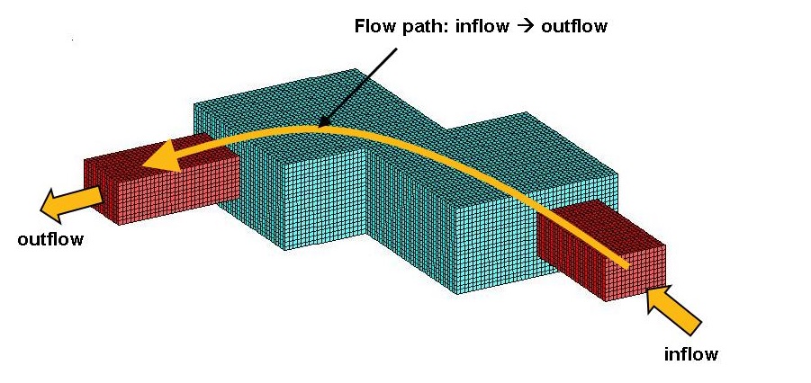 Here, one flow path is defined referencing an inflow and an outflow cellface group. Multiple <PATH> commands can be used to define multiple flowpaths in the same <FLOW_PATHS> command block. A single cellface group can also be referenced in different <PATH> commands. For example, consider a model with one inlet and two outlets where backflow along both paths is to be minimized. In this case, one would define two flow paths, both referencing the same inflow flow boundary: