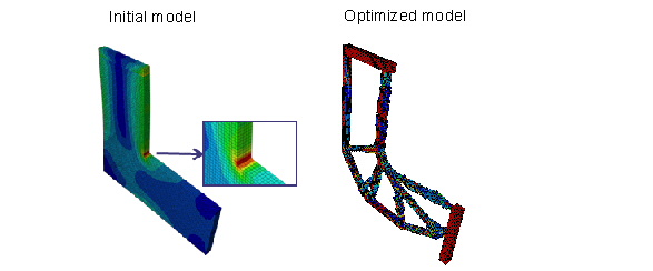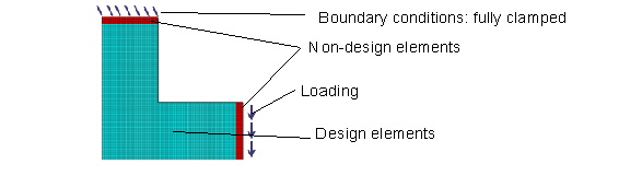 The described example uses the following model: (Design elements are shown in blue, the elements in red are defined as nondesign elements because of loads and boundary conditions.)