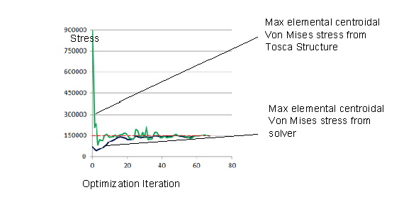 The following diagram shows the difference between the maximal elemental centroidal von Mises stress from the solver and from SIMULIA Tosca Structure: