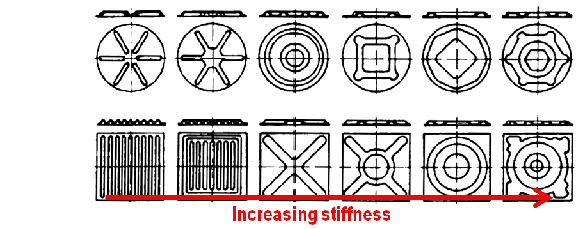 The bead height (see figure above) has the most significant effect on the stiffness of the plate structure. Usually, the greater the bead height the greater the stiffness. But, the bead height is usually controlled by manufacturing capabilities, that is, how deep can you draw a bead with your available tools. The bead width has an effect on the possible designs. As seen in the figure below (taken from Oehler and Weber: "Steife Blech- und Kunststoffkonstruktionen", Springer-Verlag GmbH (1972)), a small or a large bead width is not necessarily related to the stiffness of the sheet structure. The Tosca Structure.bead default values usually suffice, but if an optimal solution is sought you must try more bead widths.