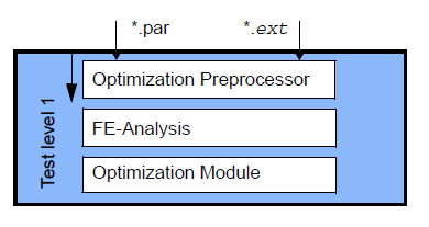 the evaluation of the parameter file ( When a modified analysis model has been generated from one evaluation of the preprocessing results and the FE results, the optimization is stopped. The modified analysis model is not analyzed by the finite element solver at this test level.