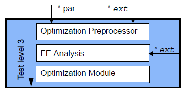 Test Level 4Test level 4 is an extension of test level 2. A result file must exist in the start directory of the optimization job. This result file must contain all results required for the optimization. In test level 4 and during the first iteration, the present result file is copied to the working directory. The optimization continues as normal until convergence has been achieved or a stop condition has been met. Using this test level, the finite element analysis performed in the first iteration of an optimization can be reused for a completely different optimization performed on the same model. Because the results of the initial model are always the same, the same result file can always be used and does not need to be recalculated each time. A possible call could be as follows: