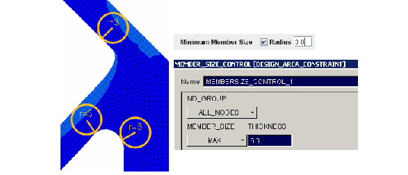 For the definition of minimum member size a radius is specified, such that normal to the surface
