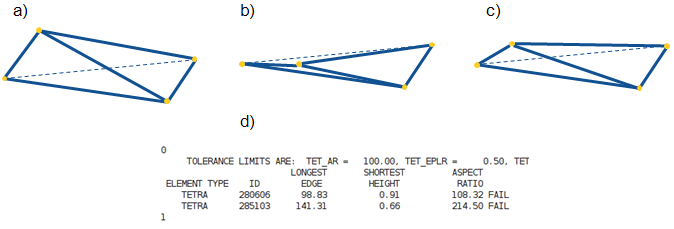 a) Original element, b) Optimized element with bad aspect ratio (d),