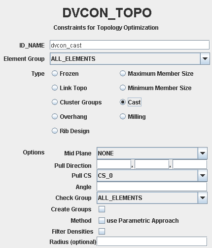Define a Demold Restriction in Tosca Structure.gui Choose Command > DVCON_TOPO in Tosca Structure.pre. Set the options for the demold restriction definition as shown in the following figure: