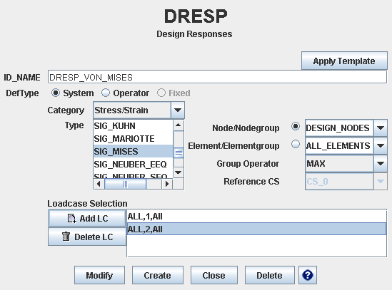 SIMULIA Tosca Structure Parameter File The resulting command in the parameter file look like follows: DRESP ID_NAME = DRESP_VON_MISES DEF_TYPE = SYSTEM TYPE = SIG_MISES ND_GROUP = design_nodes LC_SET = ALL,1,All LC_SET = ALL,2,All GROUP_OPER = Max END_ OBJ_FUNC ID_NAME = MY_OBJ_FUNC TARGET = MINMAX DRESP = DRESP_VON_MISES, , END_