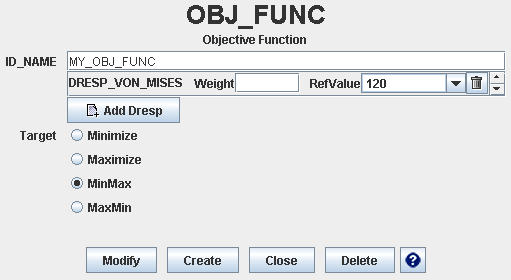 Minimize the Maximum Equivalent Stress in Tosca Structure.gui Choose Command > DRESP. The DRESP menu appears. Set Type = SIG_MISES as shown in the following figure: Choose Command > OBJ_FUNC. The OBJ_FUNC menu appears. Select Target= MinMax. Set RefValue to 120.