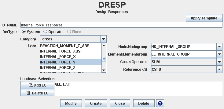 SIMULIA Tosca Structure Parameter File The resulting command in the parameter file look like follows: DRESP ID_NAME = internal_force_response DEF_TYPE = SYSTEM TYPE = INTERNAL_FORCE_Y EL_GROUP = EL_INTERNAL_GROUP ND_GROUP = ND_INTERNAL_GROUP LC_SET = ALL,1,All GROUP_OPER = Sum CS_REF = CS_0 END_