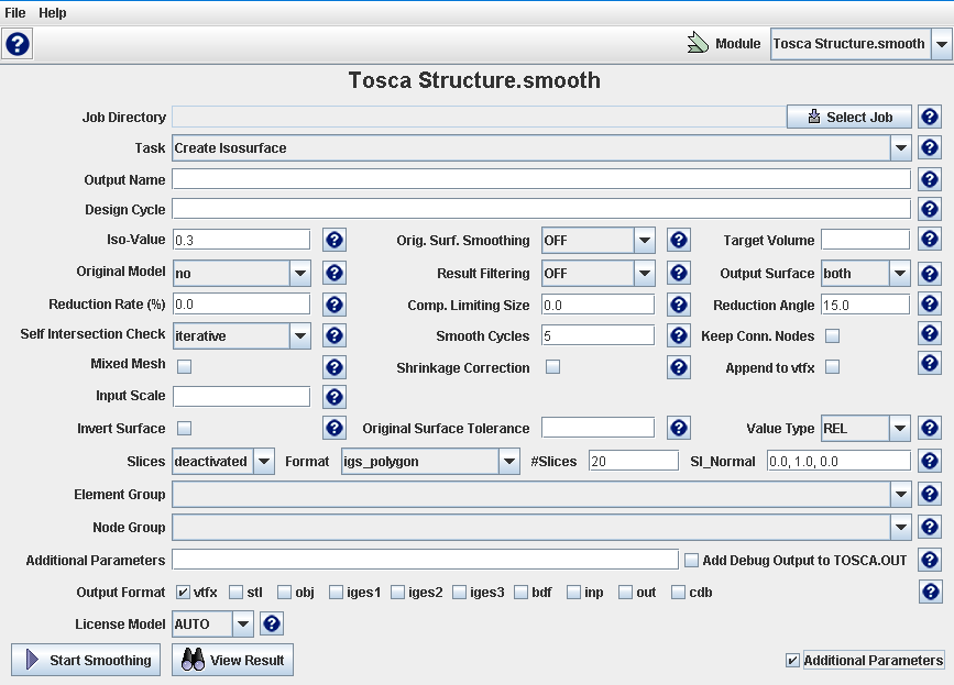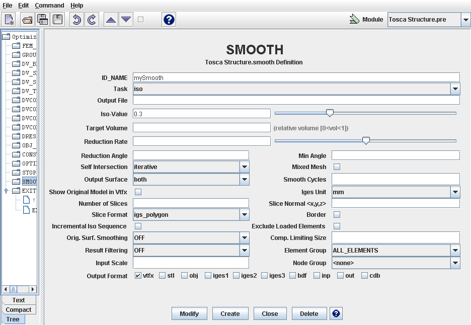 The following table summarizes the Tosca Structure.SMOOTH parameters and the corresponding fields in the Tosca Structure.gui: